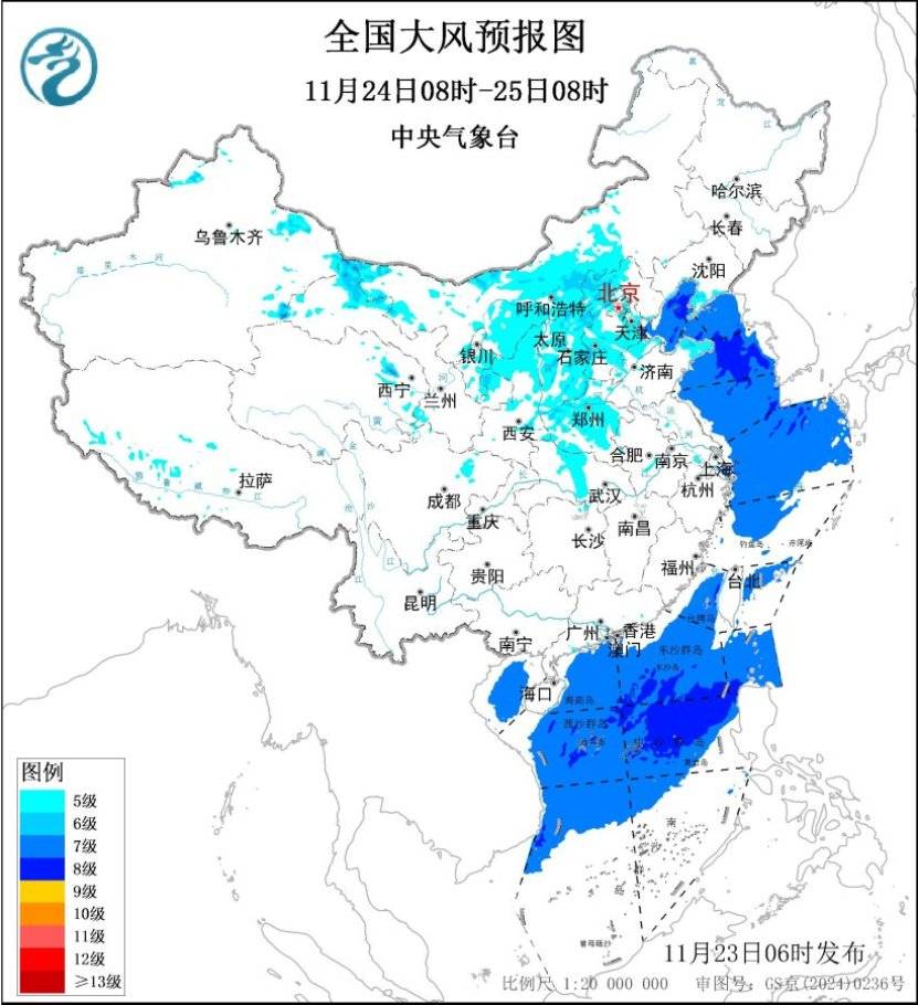 中央气象台11月23日06时继续发布大风蓝色预警。预计,11月23日08时至24日08时,新疆东部、内蒙古中西部、甘肃河西地区、青海中北部、西北地区东北部、华北西部等地的部分地区有5~7级大风,阵风8~9级(见图1)。11月24日08时至25日08时,内蒙古中西部、甘肃北部、青海东北部、西北地区东部、华北等地的部分地区有5~7级大风,阵风8~9级,黄淮北部和西部、江汉等地的部分地区有5~6级大风,局部地区阵风7~8级;渤海、黄海中部和南部局地、南海北部和中部海域将有7~8级、阵风9~10级的大风(见图2)。
