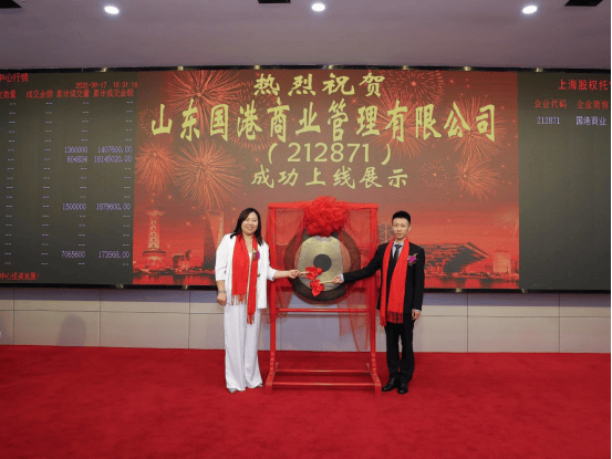 2025年9月17日,山东国港商业管理有限公司 (企业简称:国港商业,企业代码:212871)挂牌仪式在上海股权托管交易中心隆重举行。